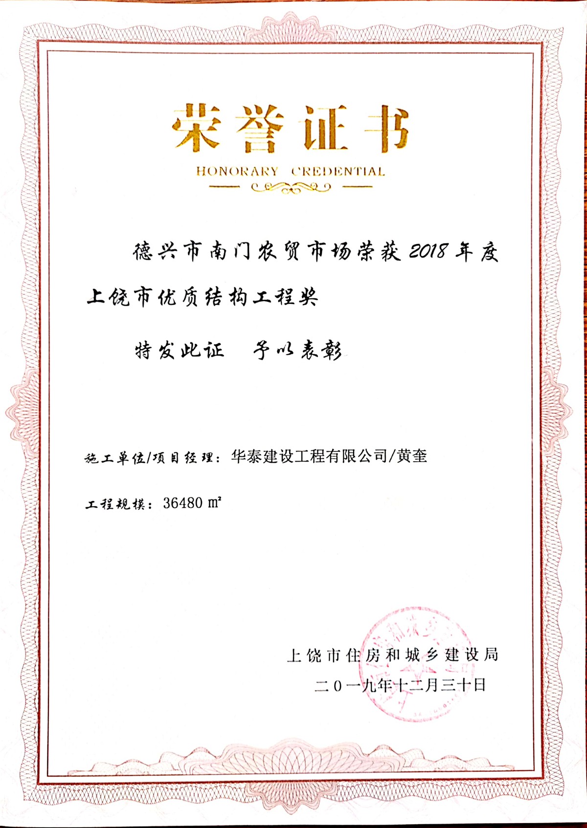 日前,由華泰建設(shè)工程有限公司承建的上饒德興南門農(nóng)貿(mào)市場項(xiàng)目,榮獲了上饒市住房和城鄉(xiāng)建設(shè)局頒發(fā)的“2018年度上饒市優(yōu)質(zhì)結(jié)構(gòu)工程獎”。
