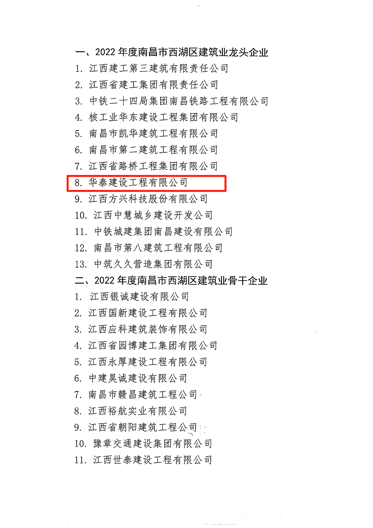 2023年2月21日,恰逢農(nóng)歷二月二龍?zhí)ь^,在這個(gè)紅紅火火的日子,南昌市西湖區(qū)住房和城鄉(xiāng)建設(shè)局發(fā)布了《關(guān)于公布2022年度南昌市西湖區(qū)建筑業(yè)龍頭企業(yè)、骨干企業(yè)名單的通報(bào)》,經(jīng)層層嚴(yán)格考評認(rèn)定,華泰建設(shè)工程有限公司憑借實(shí)干篤行與卓越品質(zhì)獲得“2022年度南昌市西湖區(qū)建筑業(yè)龍頭企業(yè)”榮譽(yù)稱號!這是繼2023年1月獲得“2022年度南昌市建筑業(yè)骨干企業(yè)”后的又一個(gè)榮譽(yù)認(rèn)證。這不僅是對華泰建設(shè)的嘉獎(jiǎng)與再次肯定,更是對華泰建設(shè)發(fā)展的激勵(lì)與鞭策。